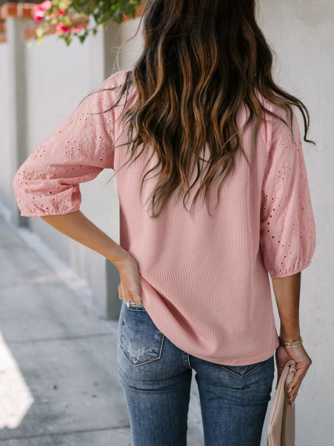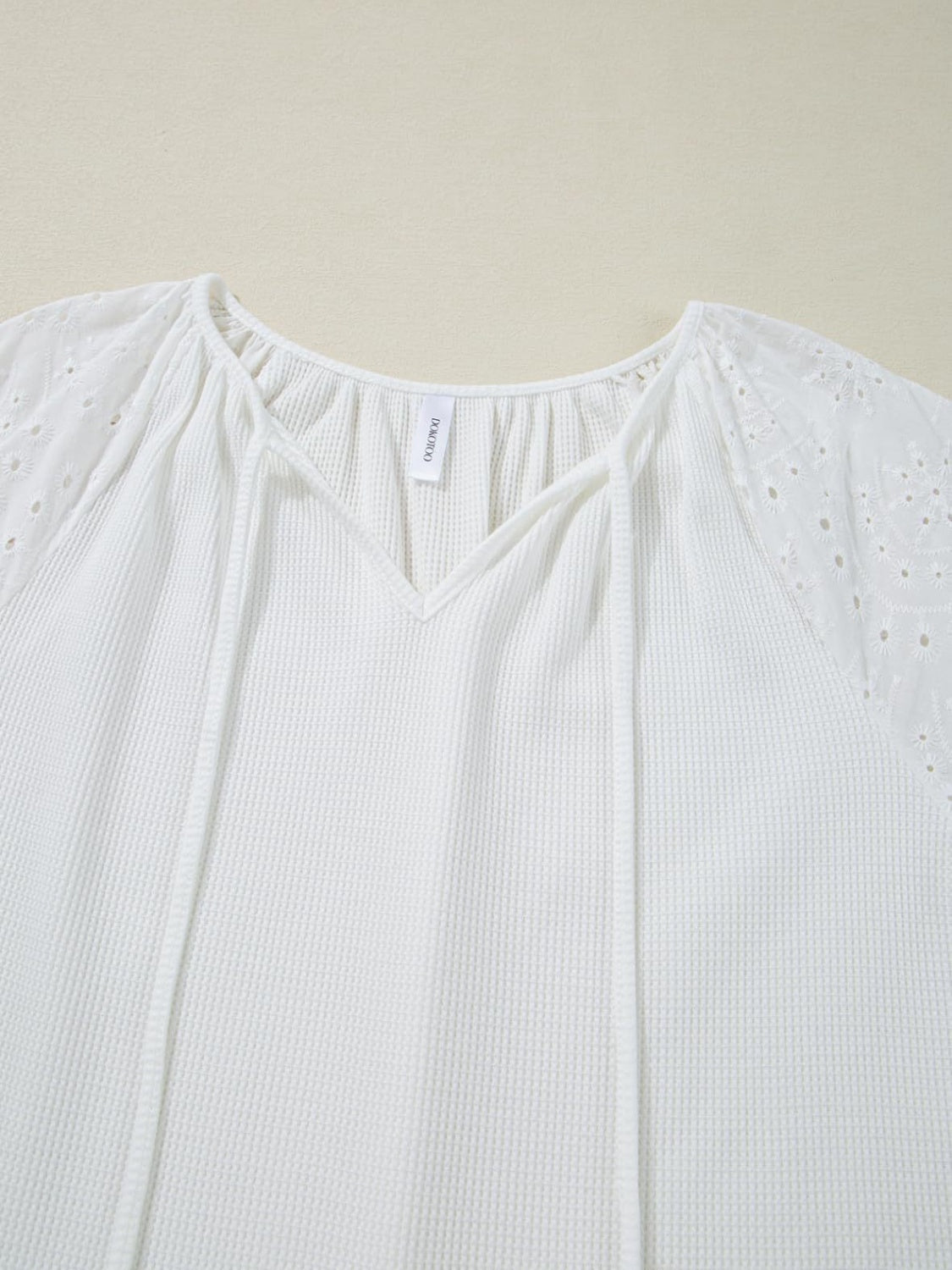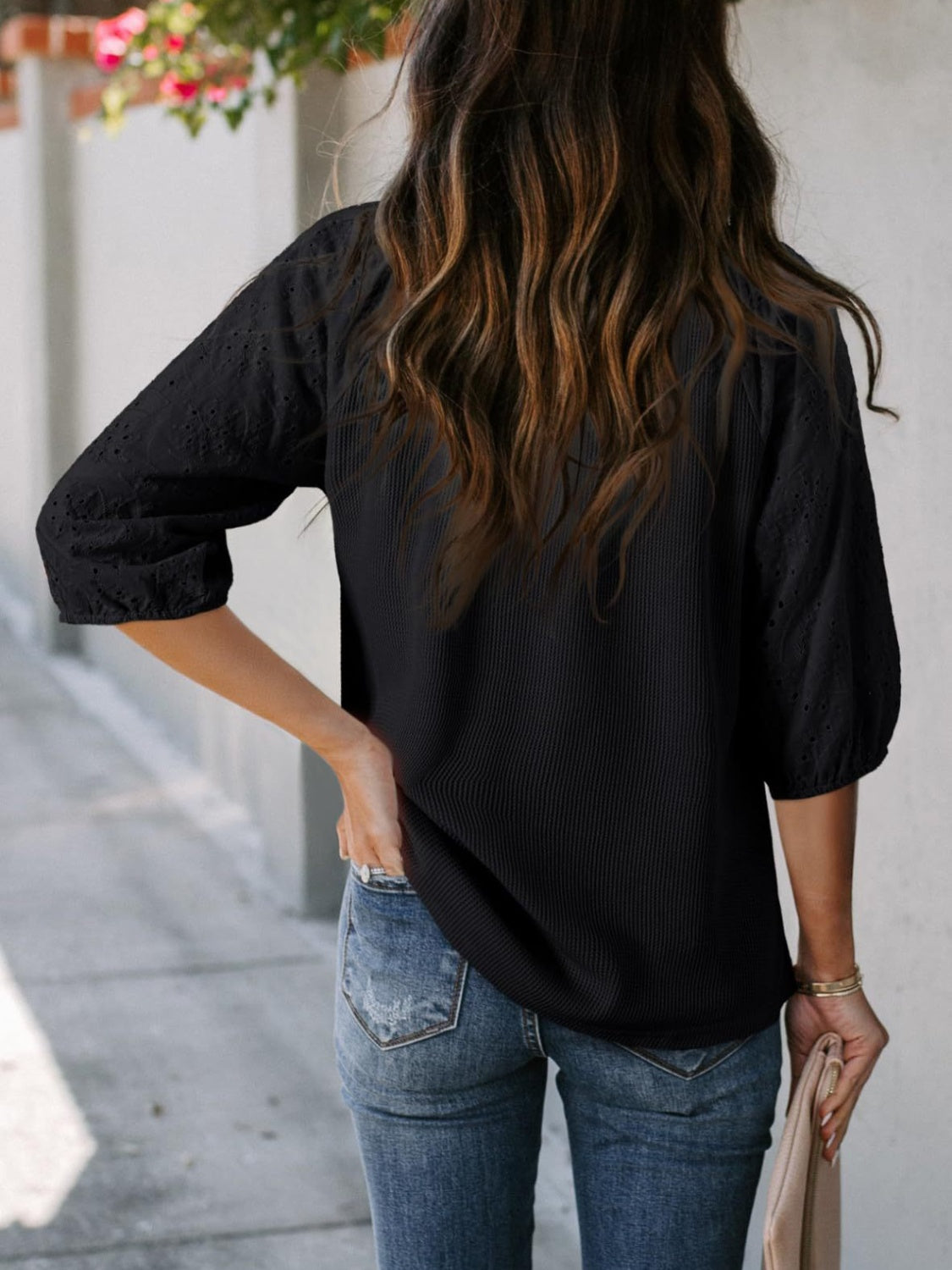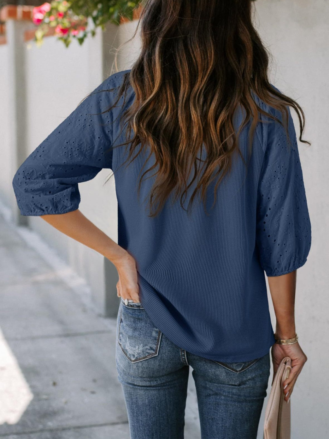 Eyelet Tie Neck Three-Quarter Sleeve Blouse