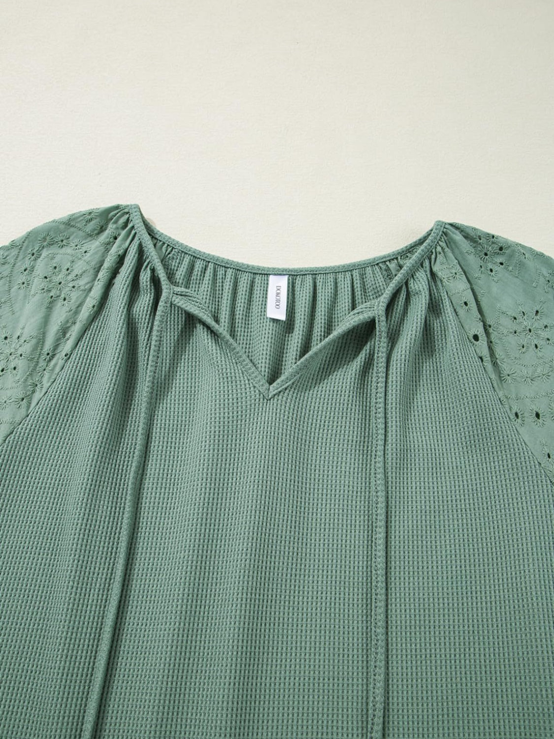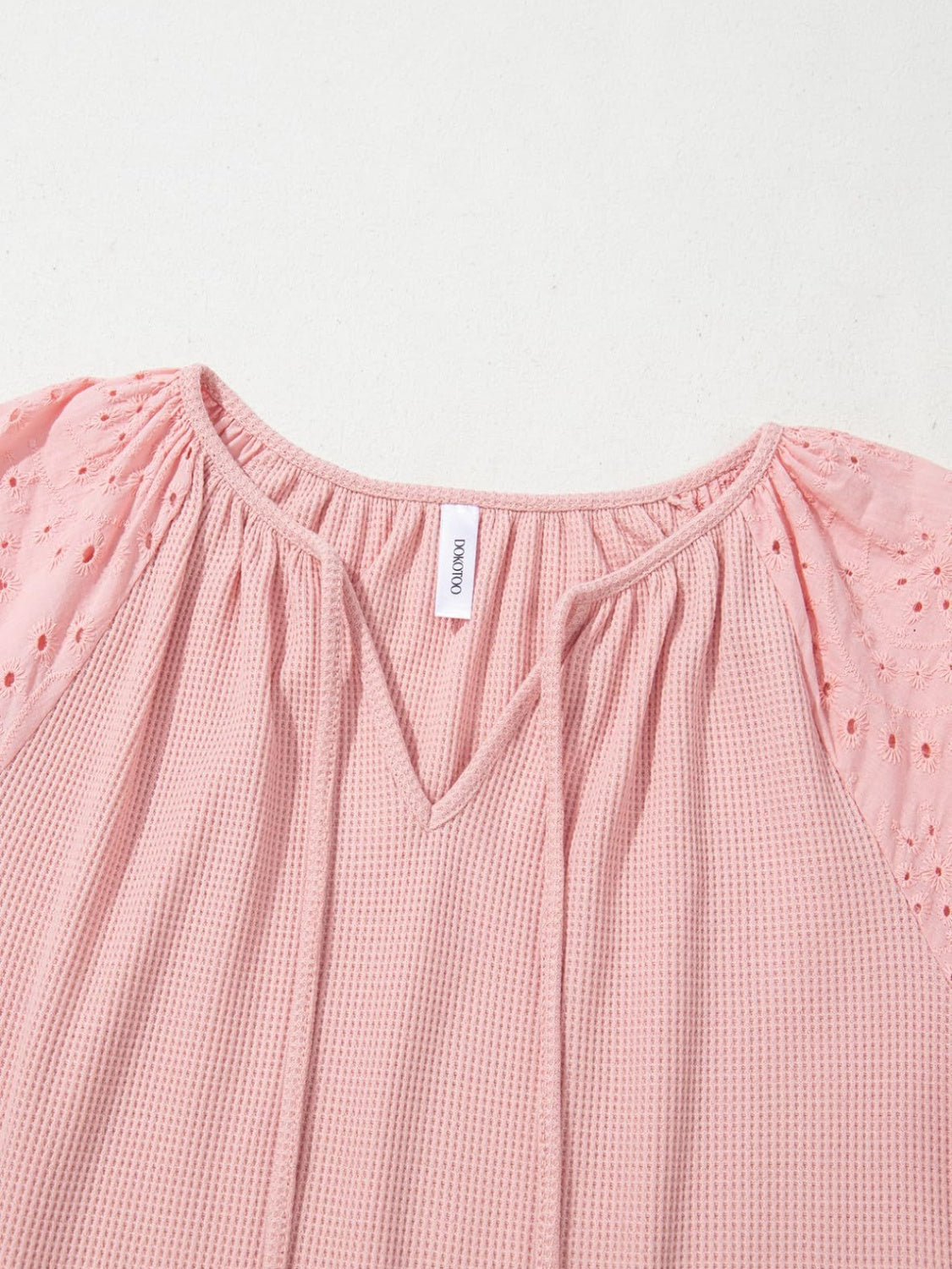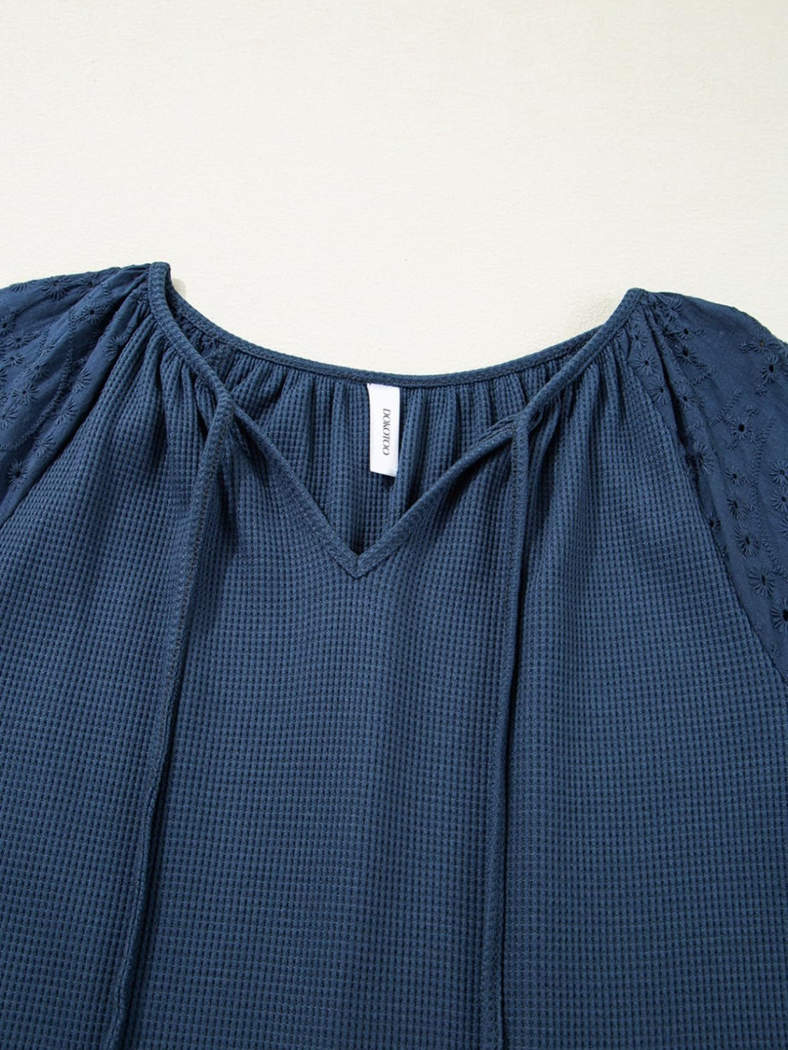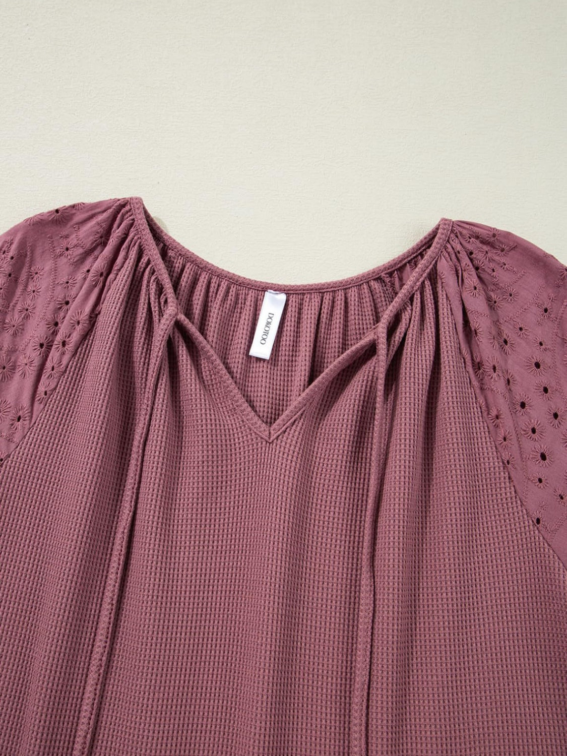 Eyelet Tie Neck Three-Quarter Sleeve Blouse