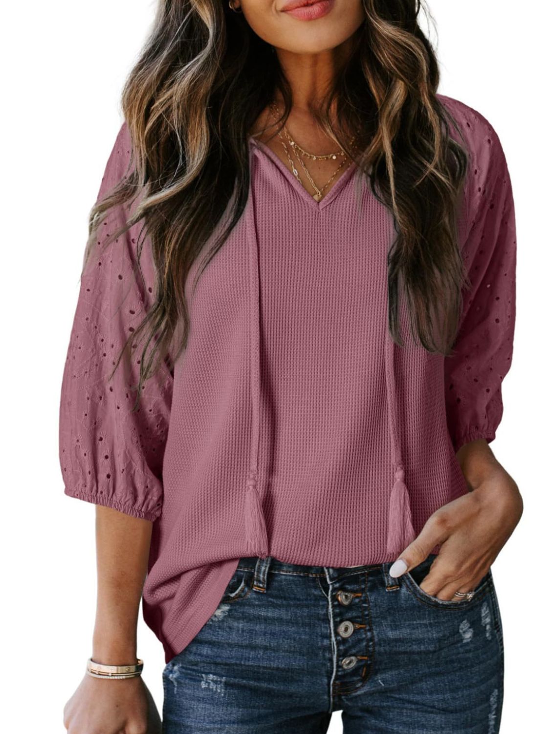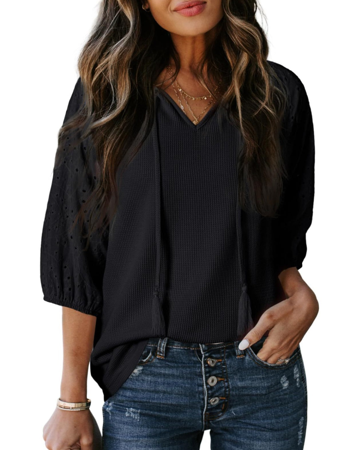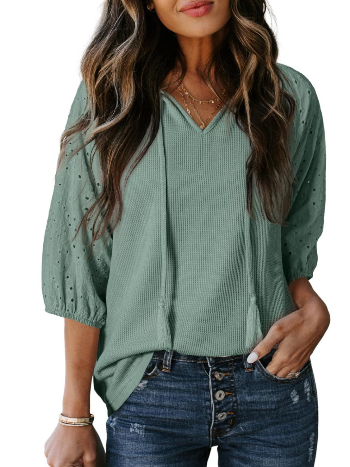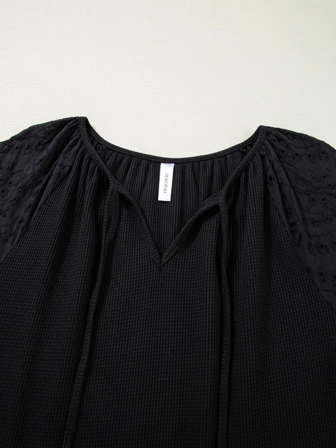 Eyelet Tie Neck Three-Quarter Sleeve Blouse