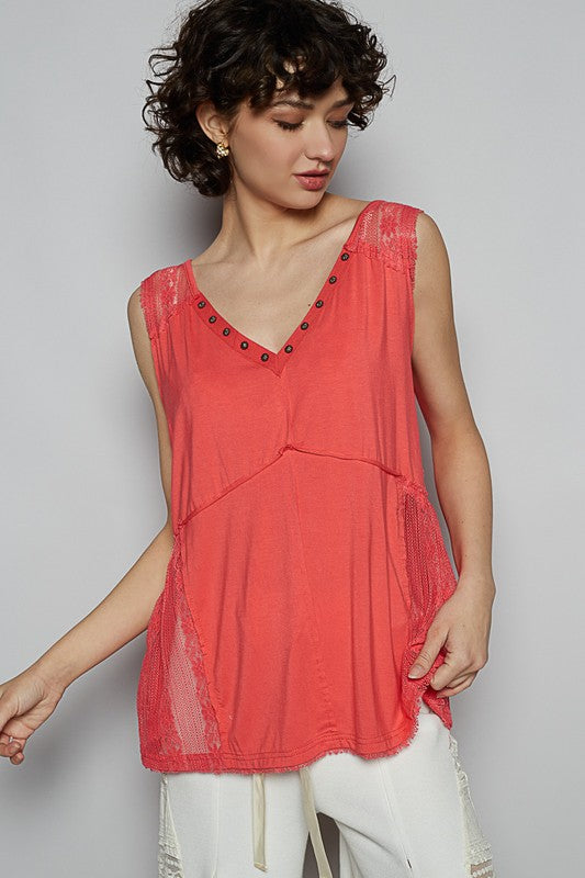 POL Lace Detail Studded Crisscross Back V-Neck Sleeveless Top